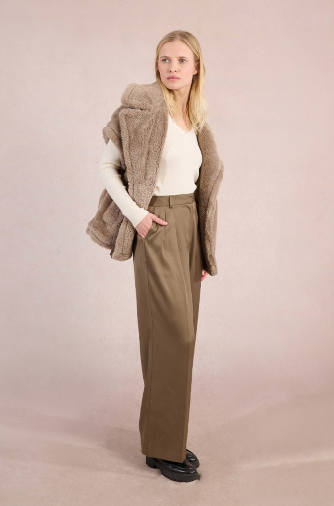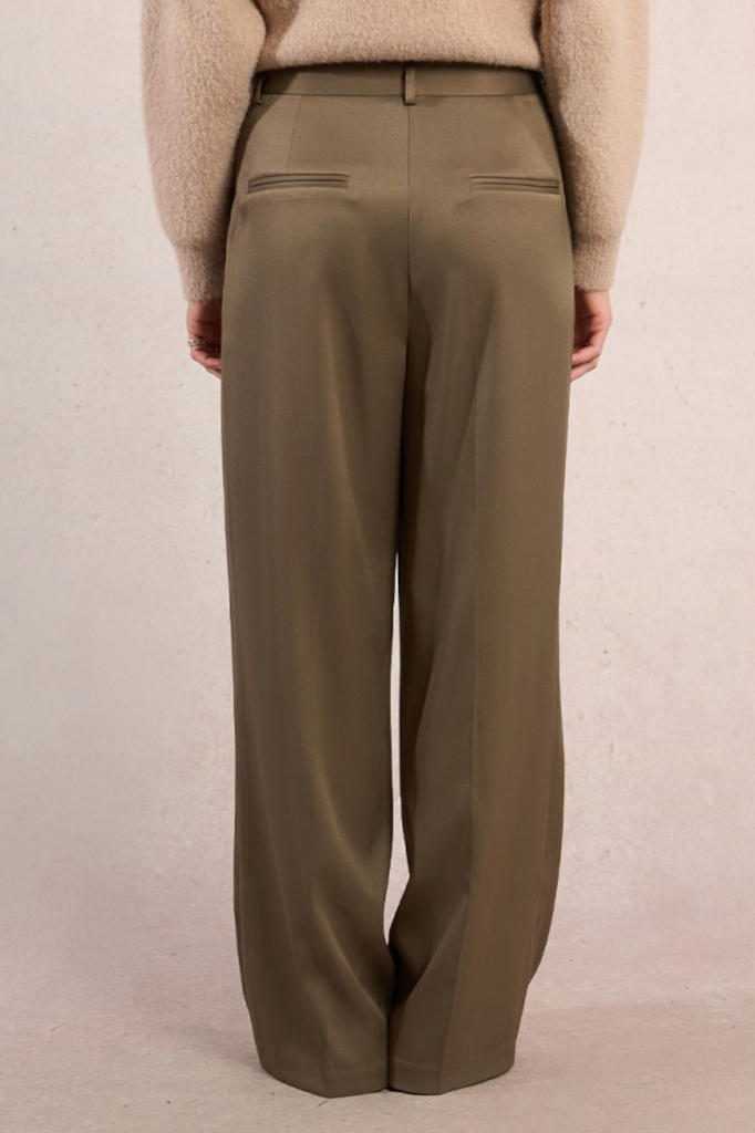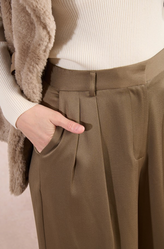 Wide high-waisted pleated pants. Belted with loops, wide darts on the center front. Zip fly and hook closure, side pockets and straight fit.