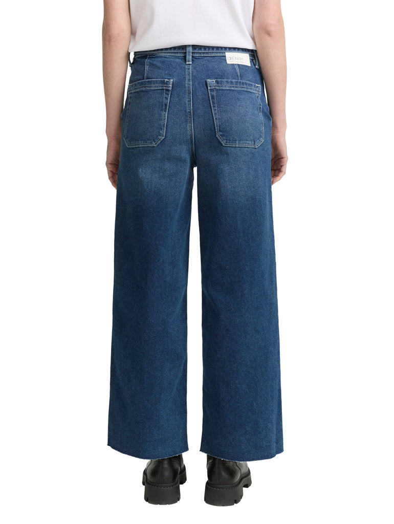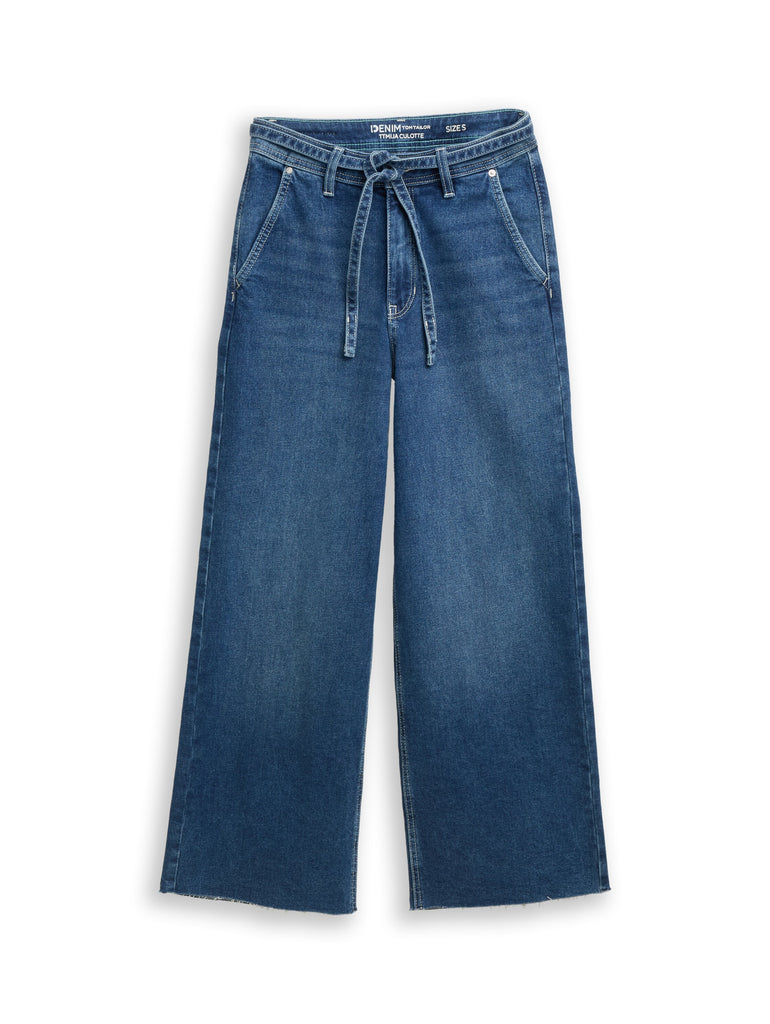 - High-waisted denim trousers with a tie belt. In a four-pocket style with side slit pockets at the front and patch pockets at the back.