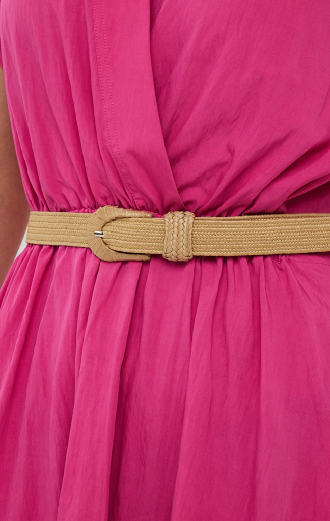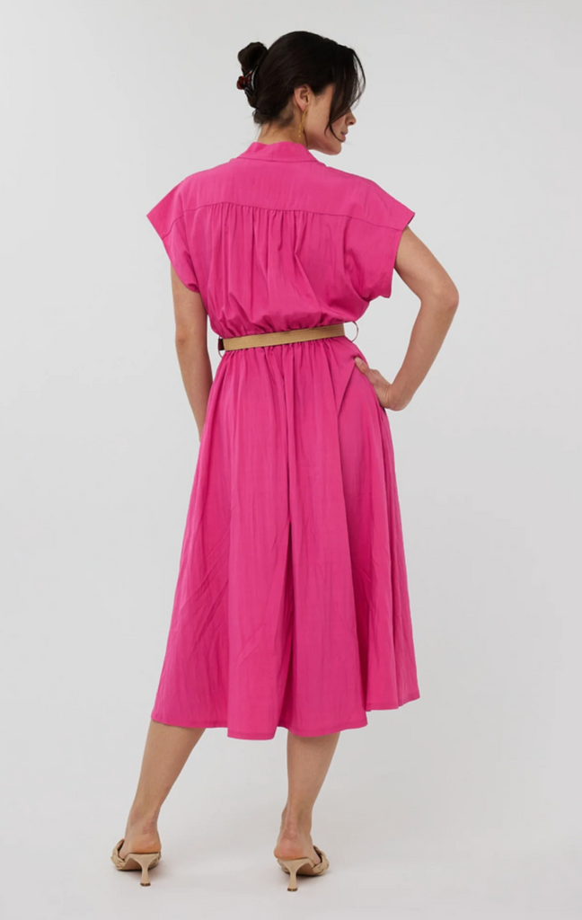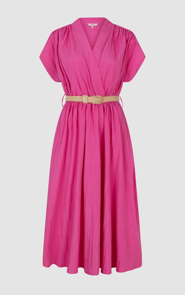 Elegant a-line dress with pleated detail and side pockets. This dress brings elegance and comfort together in one design. The belt that accentuates the waist is included with the dress.