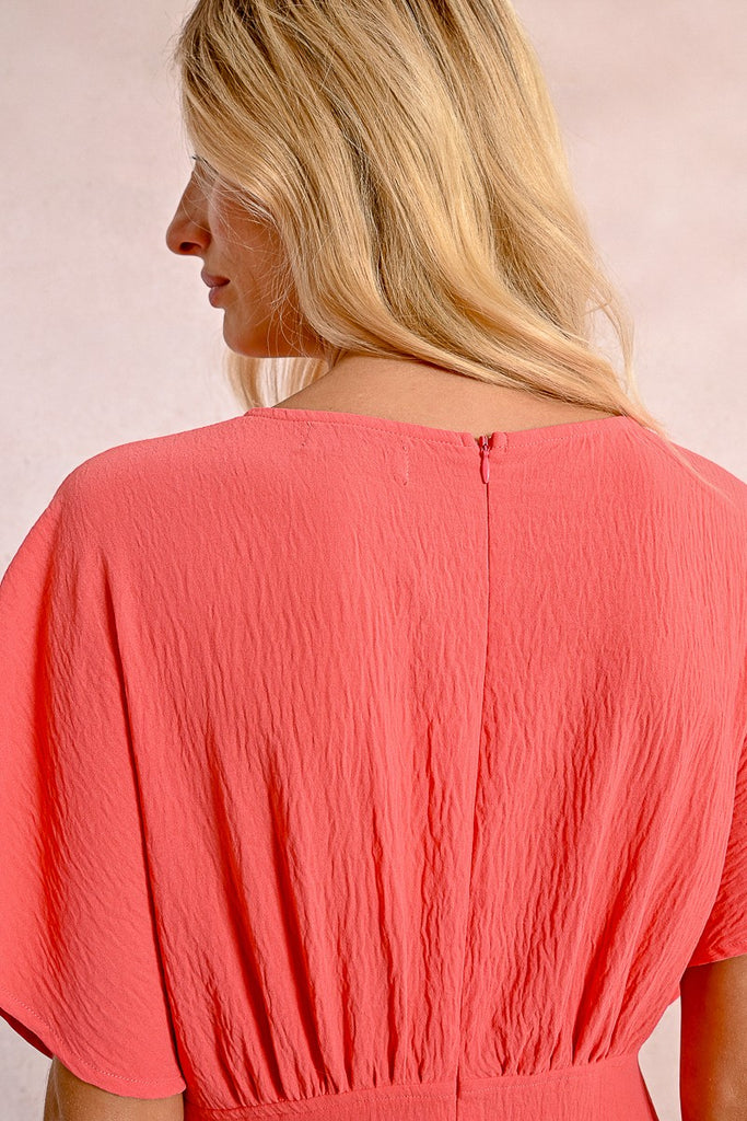 Long and flowing dress.  Short and wide sleeves.  Wide V neckline.  Chest highlighted with pleats.